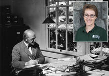 Thomas A. Jaggar, shown at his desk circa 1925, founded the Hawaiian Volcano Observatory in 1912 and served as its Director until he retired in 1940. Since then, volcano monitoring and research efforts in Hawaii have been guided by 19 scientists who have served as HVO's "Director" or "Scientist-in-Charge." In 2015, Christina Neal (inset) became HVO's most recent Scientist-in-Charge. USGS photos.