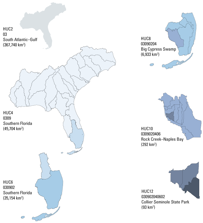 The U.S. Geological Survey uses a depiction and classification scheme for hydrologic units known as hydrologic unit codes (HUCs). HUCs generally represent catchments, and river basins are represented by a unique series of numbers with successively smaller hydrologic units nested inside of larger ones. Digits are added as hydrologic units become smaller, such that a 2-digit HUC encompasses multiple 4-digit HUCs, and a 4-digit HUC encompasses multiple 6-digit HUCs, etc. This assessment uses 12-digit HUCs (HUC12s), which generally range from 50 to 100 square kilometers (km^2) in size. The CONUS contains 18 2-digit HUCs and over 93,000 12-digit HUCs. The HUC12 median areal extent in the conterminous United States is 90 km^2. Although in practice, HUCs represent river basins, they are formally administrative units, and not always natural watersheds. As such, HUCs can depict human-created drainages and diversions or arbitrary breaks in connected flow systems.