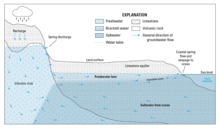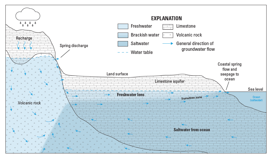 Conceptual cross section showing freshwater and saltwater in Saipan’s limestone aquifer and volcanic rock. Modified from Carruth (2003).