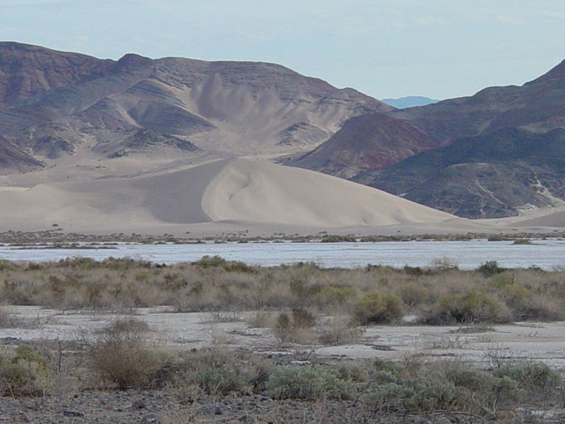 Alluvial fans and the barren wash bottom of the ephemeral Amargosa River are the primary sources of sand to the Ibex Dunes. This view shows the star dune, the highest dune in the dune field. Sand also partially blankets the flanks of the Ibex Hills in the distance.