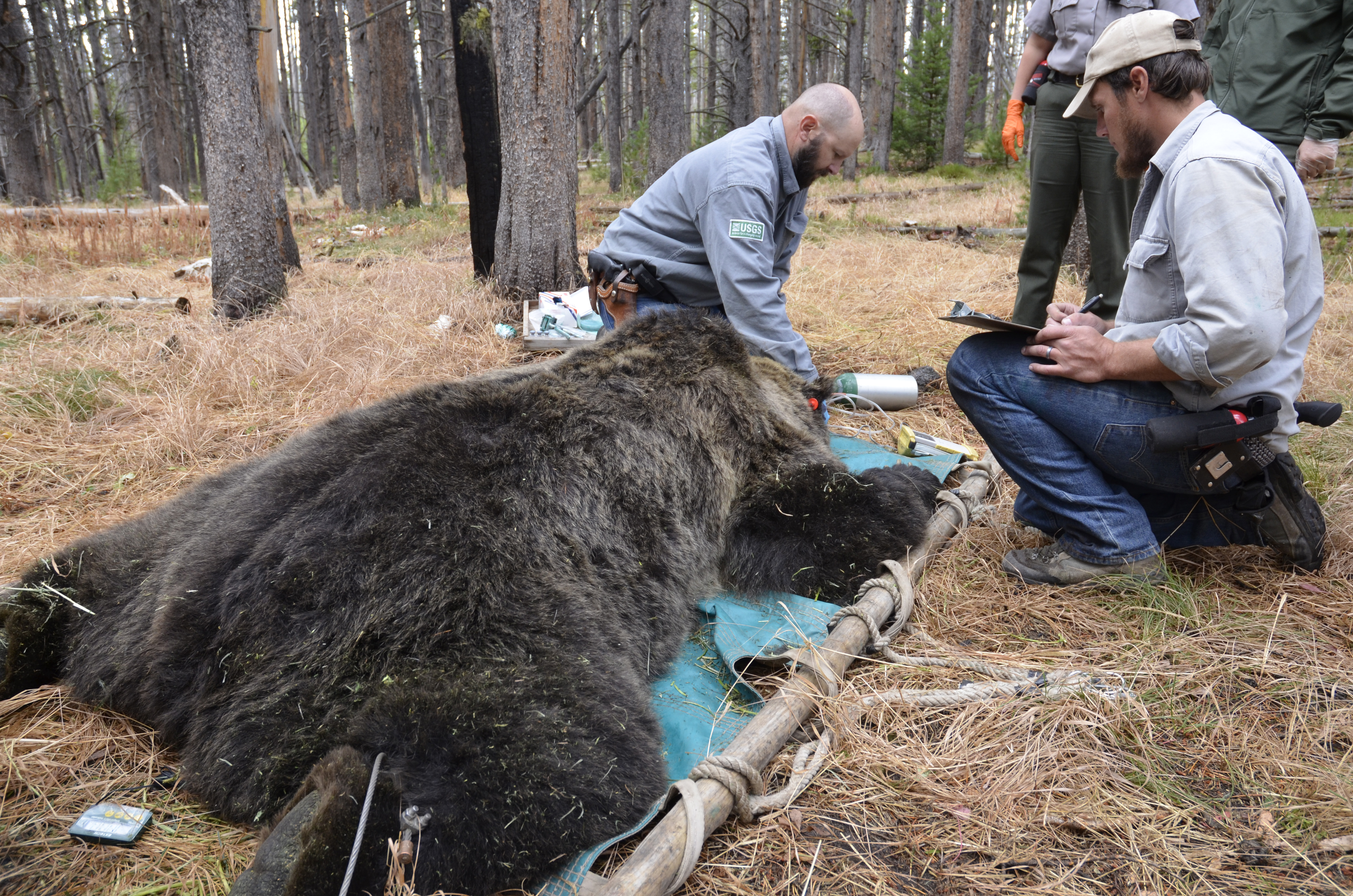 IGBST biologists collecting data on a male grizzly bear in Yellowstone