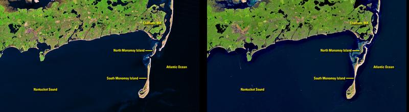 Landsat 8 scene of the coastal barriers for Cape Cod. This is a change pair image from June 12, 1984 and September 6, 2015.