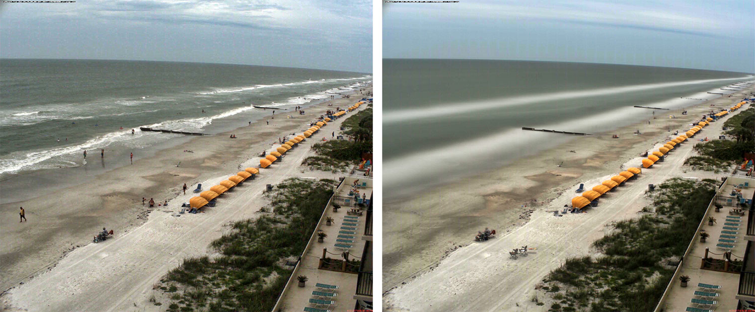 Images of Madeira Beach, Florida, from video taken June 20, 2017. Left: Snapshot (first frame of video). Right: Time-averaged image, created by averaging the intensity of light recorded at each spot, or “pixel,” during the video. The pale band offshore reveals where a sandbar caused waves to break. On the beach, the line between wet and dry sand shows the maximum wave runup during the video.