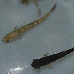 Rainbow trout fry experimentally exposed to infectious hematopoietic necrosis virus. Typical signs include darkening and exopthalmia (popeye) as shown by the fish in the lower portion of the photo. Other external signs may include fluid accumulation in the abdomen (ascites), trailing fecal casts, and small hemorrhages in the fins and body musculature.