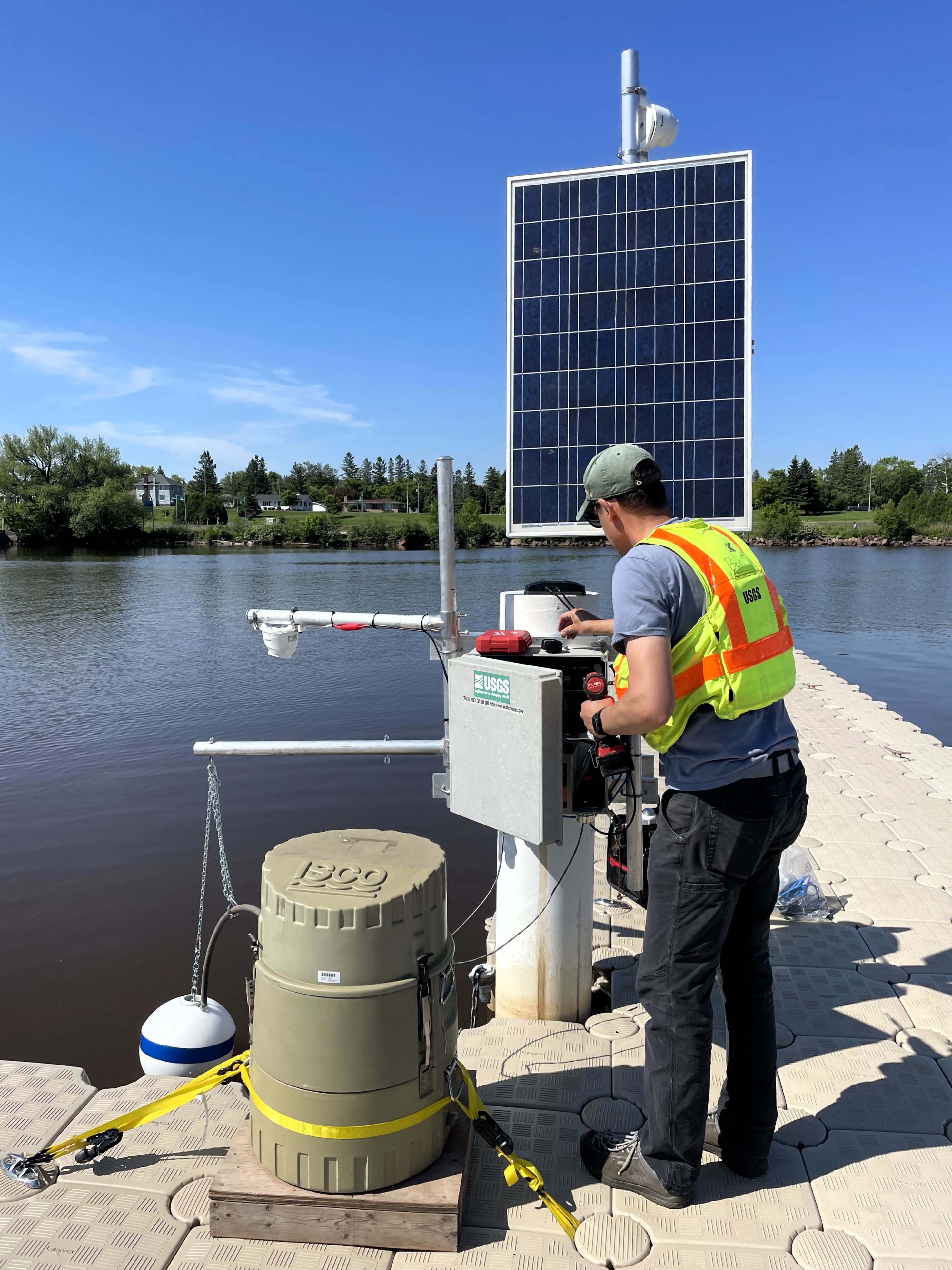 USGS Supervisory Hydrologic Technician Ben Torrison installs an automated sampler and wireless camera at Barker’s Island to aid in the remote observation of nearshore algal blooms.