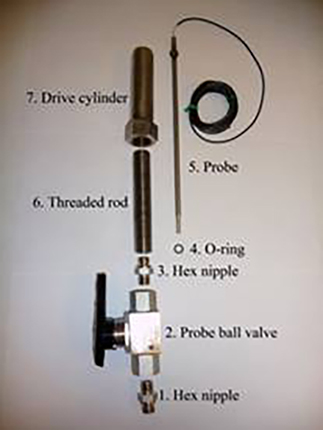 When assembled, the probe passes through the threaded rod, ball valve and into the IPTC, with an o-ring to prevent fluid leaking back along the probe length.