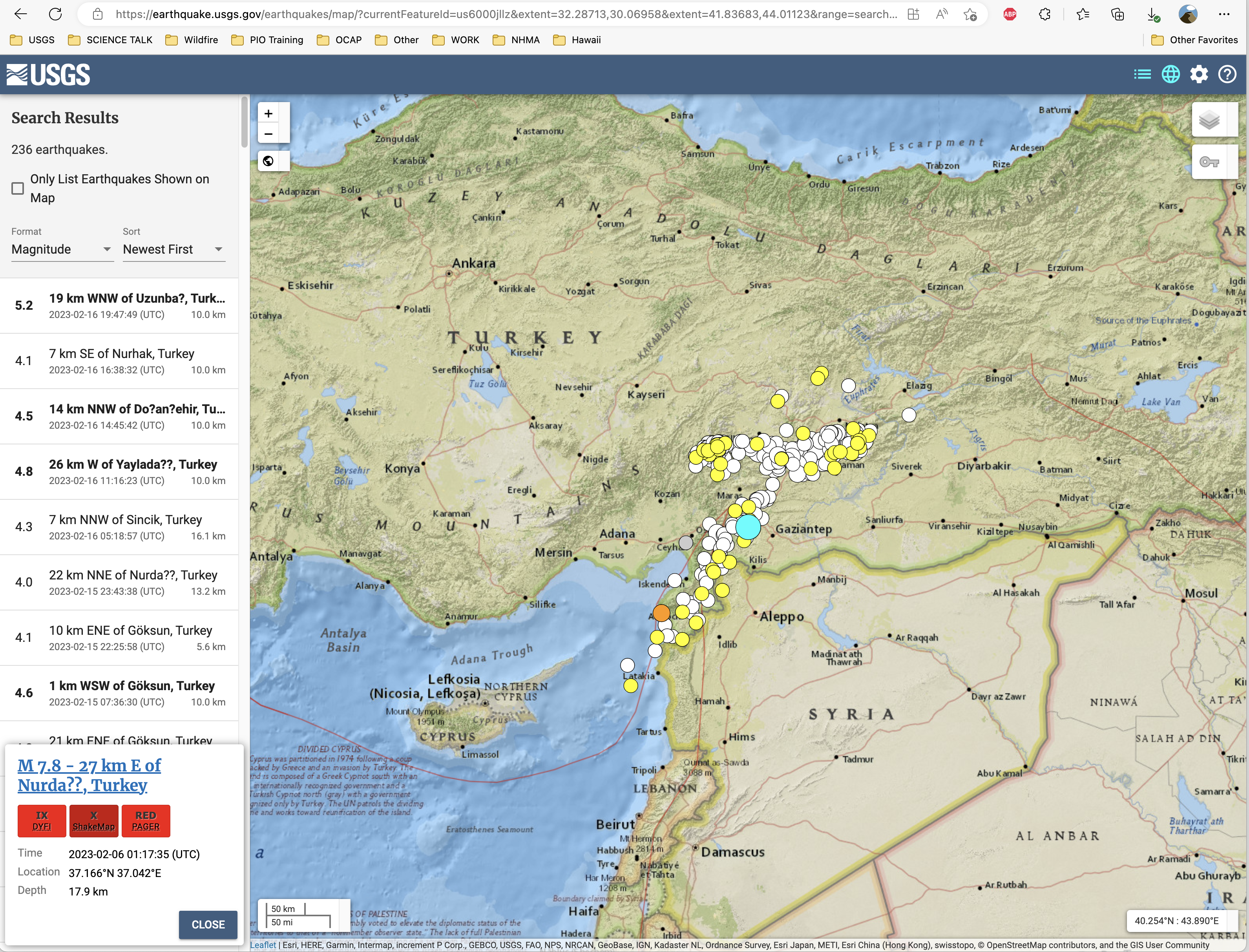 Screen capture of interactive aftershock map for Turkey earthquake sequence (2023). URL: Latest Earthquakes (usgs.gov)