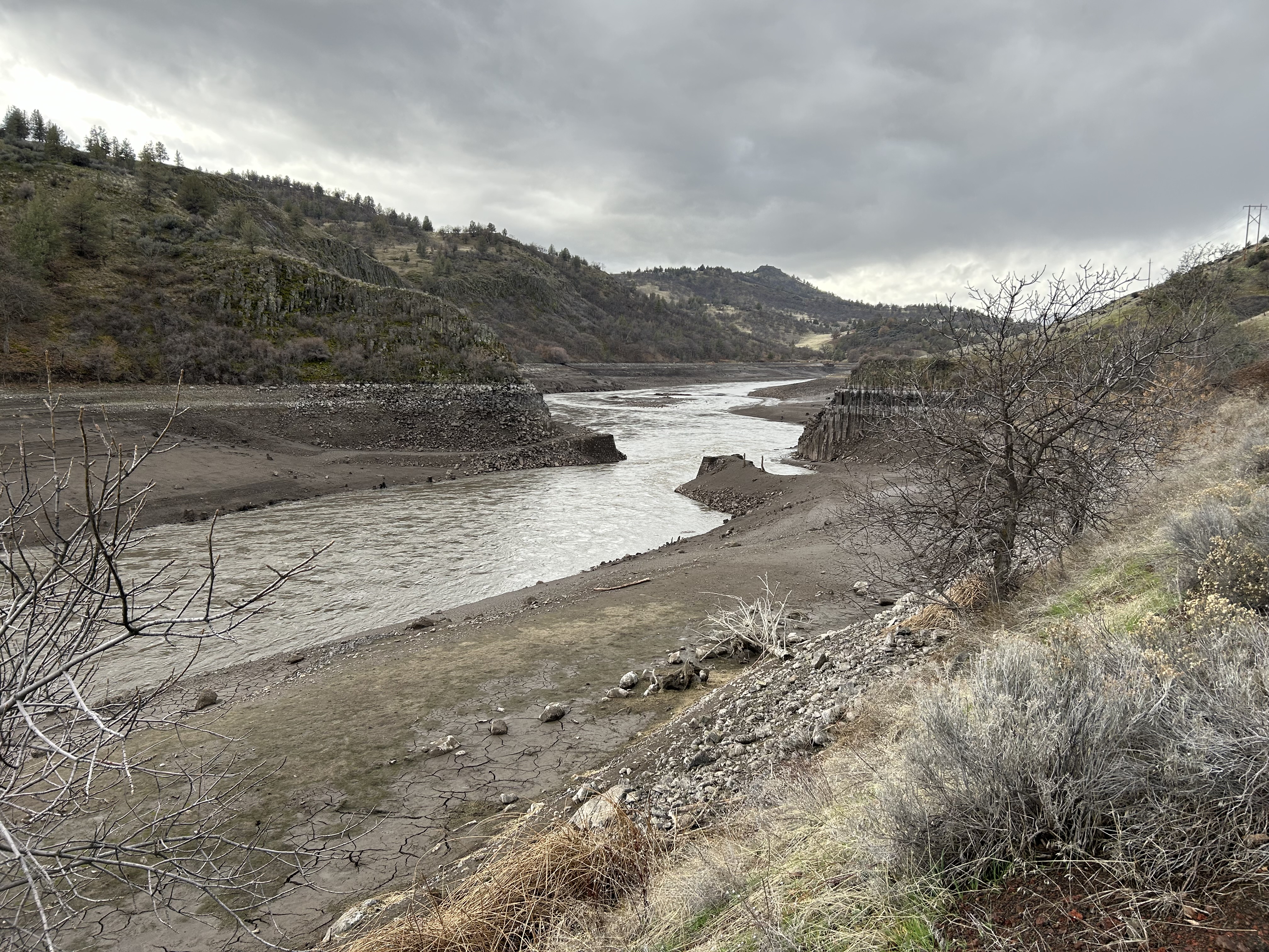 The drained Iron Gate Reservoir is a free flowing section of the Klamath River after reservoir drawdowns and damn removal.