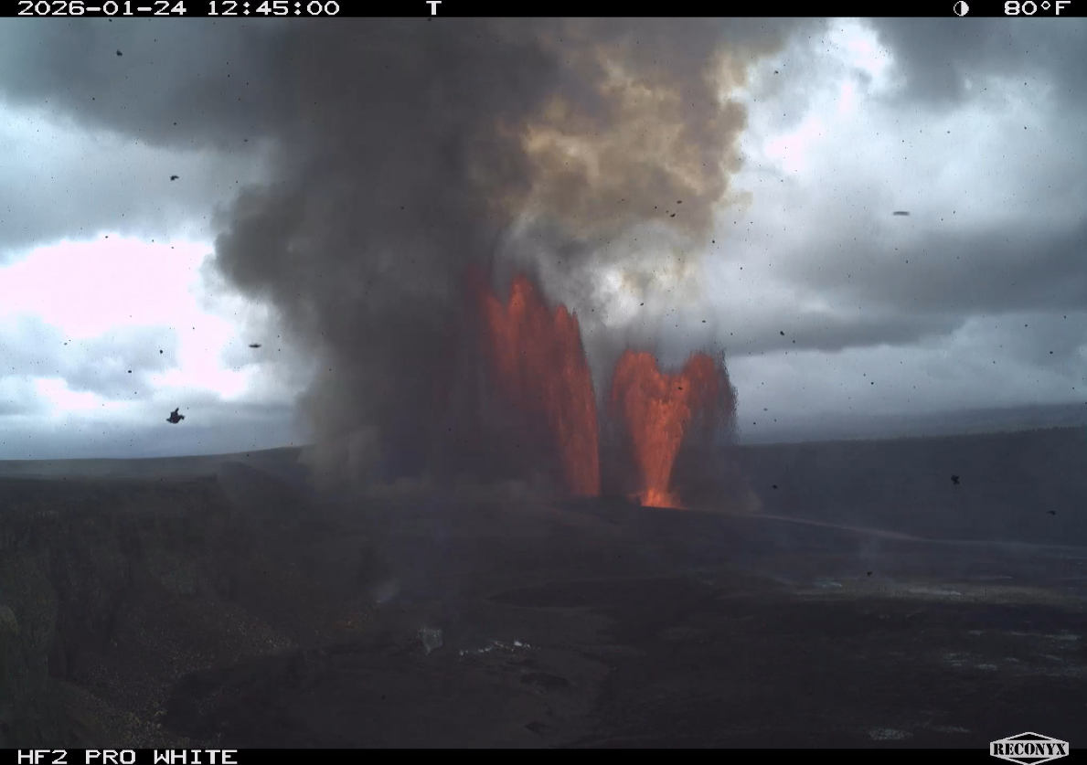 This timelapse image shows Kīlauea summit eruption episode 41 on January 24, 2026, captured by a USGS Hawaiian Volcano Observatory research camera on the south rim of the caldera. Both the north and south vents erupted. USGS photo.