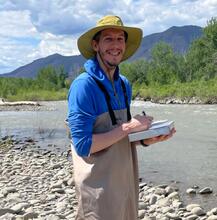 Jesse Alan Roebuck stands by a gently flowing stream, pen and notepad in hand, diligently taking notes or measurements in a serene wooded setting. Dressed in sturdy waders and a wide-brimmed hat to shield him from the sun, he embodies the spirit of a dedicated field researcher. Surrounding him are large, rugged rocks along the shore, adding to the natural beauty, while sunlight filters through the trees, enhancing the tranquil atmosphere. In the background, a majestic hill rises, inviting exploration and emphasizing the connection between human curiosity and the natural world.