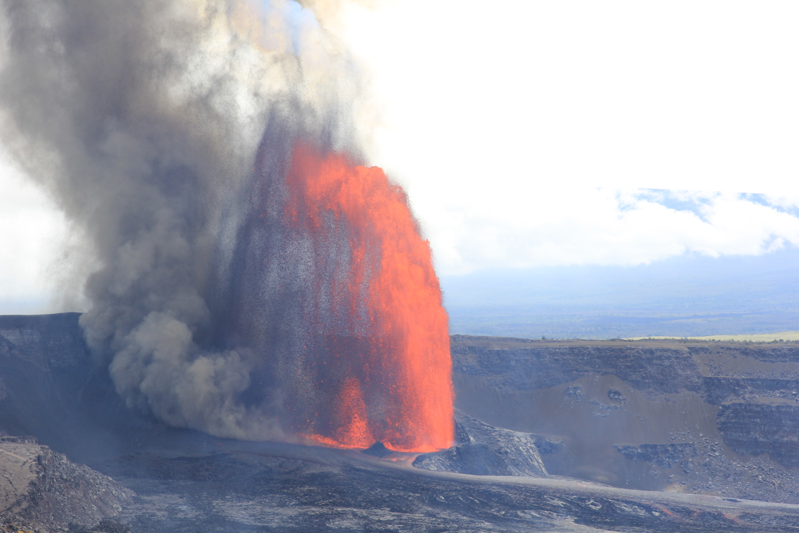 The ongoing Halema‘uma‘u Kīlauea summit eruption continued today with episode 25, which began at 11:57 am HST. Fountains from the north vent reached approximately 1000 feet (305 m) while south vent fountains were continuously less than 165 feet (50 m). Large volumes of erupted material (tephra) were deposited both within the crater and outside of the crater wall and is shown here in dark grey/black. USGS photo by H. Winslow.