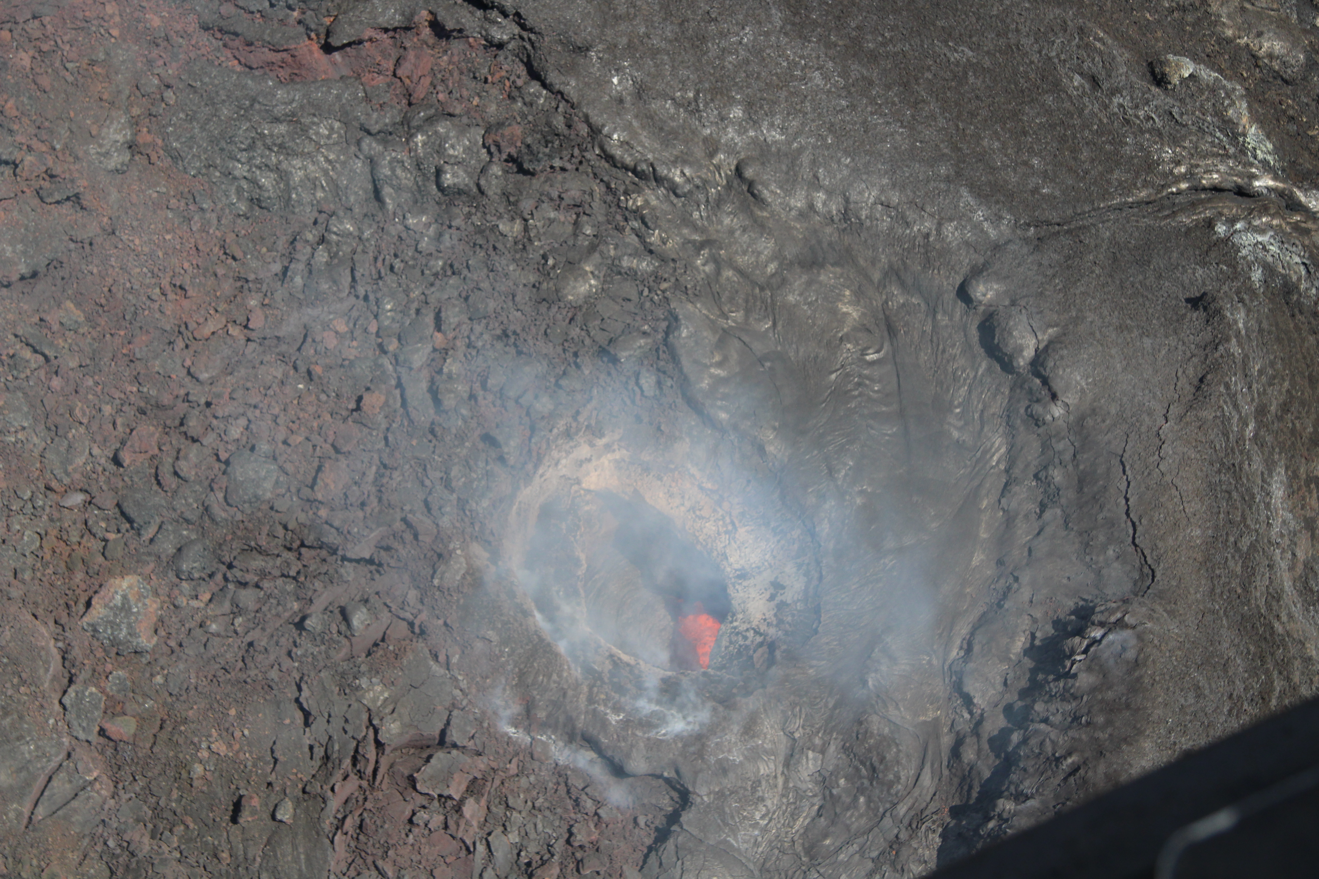 Lava was seen about 10-20 m (33-66 feet) below the rim of the north vent on June 27, 2025, during a USGS Hawaiian Volcano Observatory Kīlauea summit monitoring helicopter overflight. The north vent was glowing over the past several nights and some minor spatter was visible overnight of June 26-27. USGS photo by R. Gale.