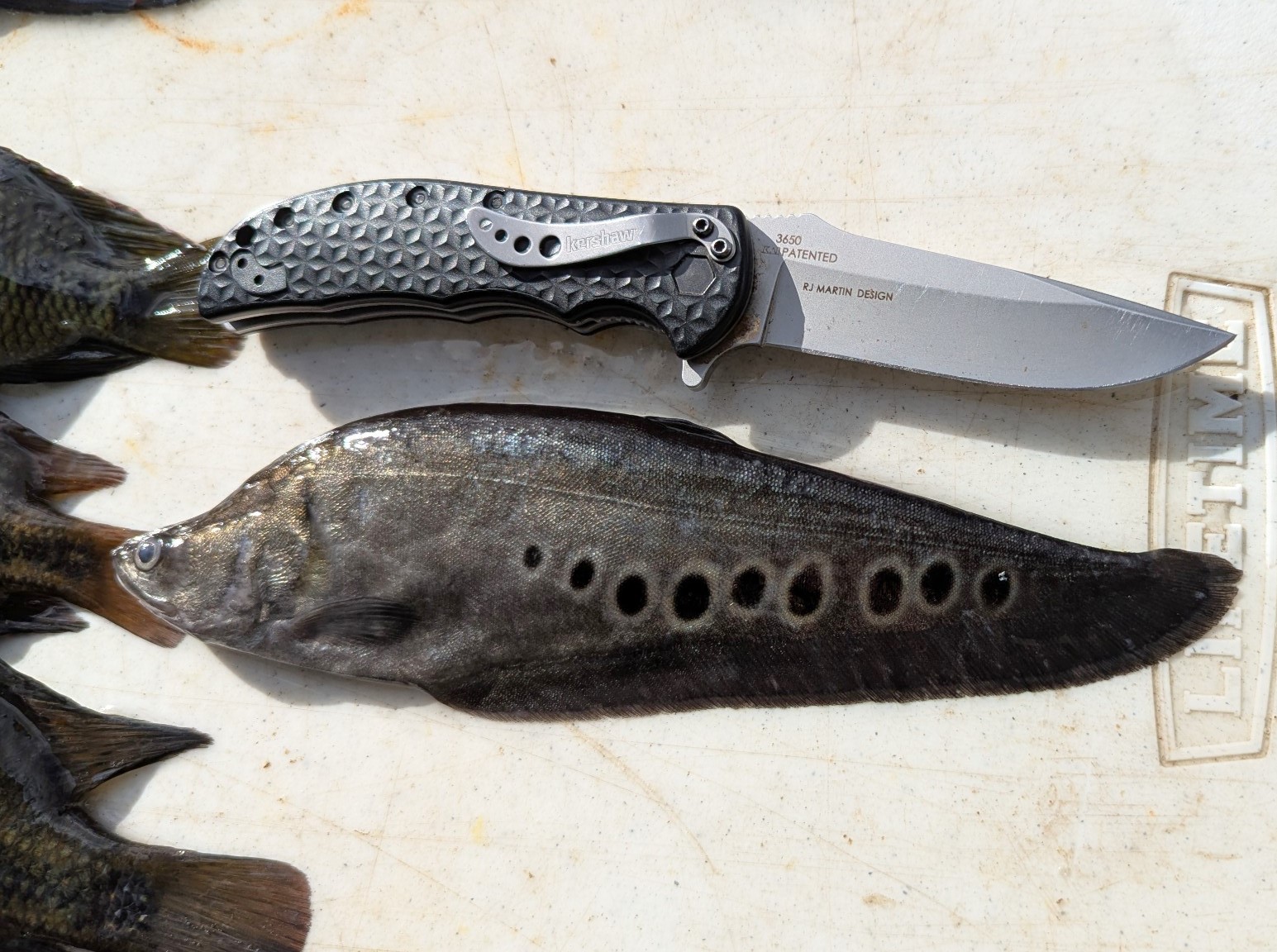 Juvenile clown knifefish, Chitala ornata, caught at Fish Slam, with a knife for scale