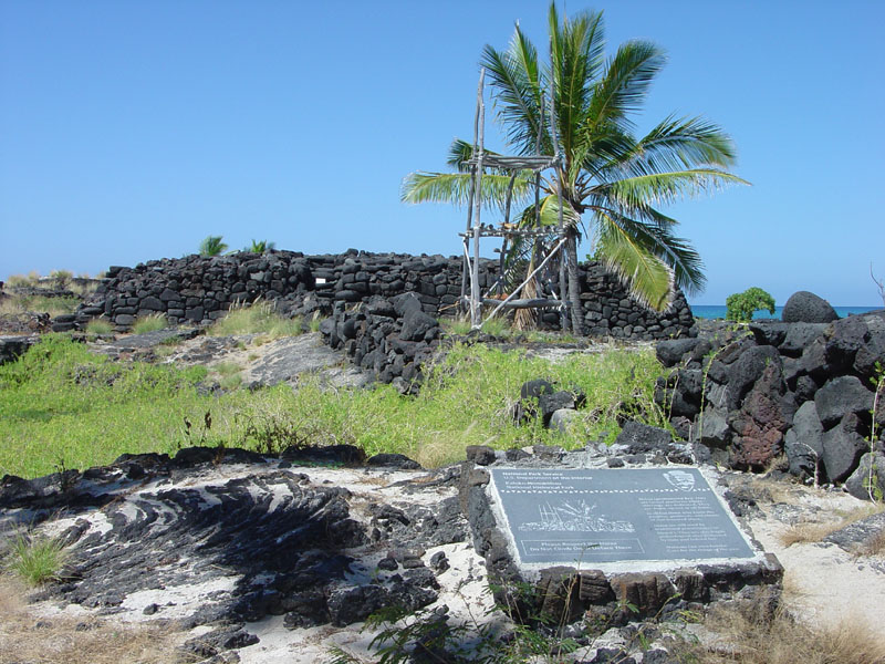 Hawaiian heiau at Kaloko: National Park Service interpretive display at a heiau at Kaloko-Honokohau National Historical Park.