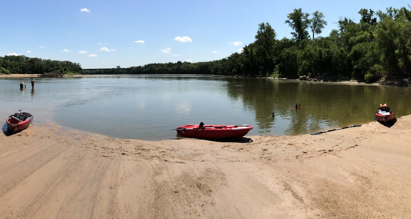 Taken along the shores of the Kansas River near DeSoto, USGS hydrologists are taking samples in the river.