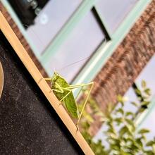 Human settlement certainly disrupts wildlife, but the smaller and more adaptable members of a disturbed ecosystem tend to remain, coloring urban landscapes as reminders of the wild from which we came. This handsome katydid stood sentinel for more than an hour over throngs of Saturday shoppers in downtown Sioux Falls, SD on August 10, 2019, perched atop the word "Fargo" on a wayfinder signaling the direction to other major cities.