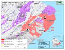 Map as of 10:00 a.m. HST, July 24, 2018. Given the dynamic nature of Kīlauea's lower East Rift Zone eruption, with changing vent locations, fissures starting and stopping, and varying rates of lava effusion, map details shown here are accurate as of the date/time noted. Shaded purple areas indicate lava flows erupted in 1840, 1955, 1960, and 2014-2015.