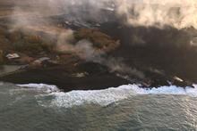On August 9, 2018, visibly active lava on Kīlauea Volcano's lower East Rift Zone was limited to a small pond deep with the fissure 8 cone and small streams of lava oozing into the ocean near Isaac Hale Beach Park (shown here) and at Kapoho Bay. USGS scientists are closely monitoring the volcano, watching for any signs that might indicate if Kīlauea's rift zone eruption and summit subsidence are pau or paused. USGS photo by I. Johanson.