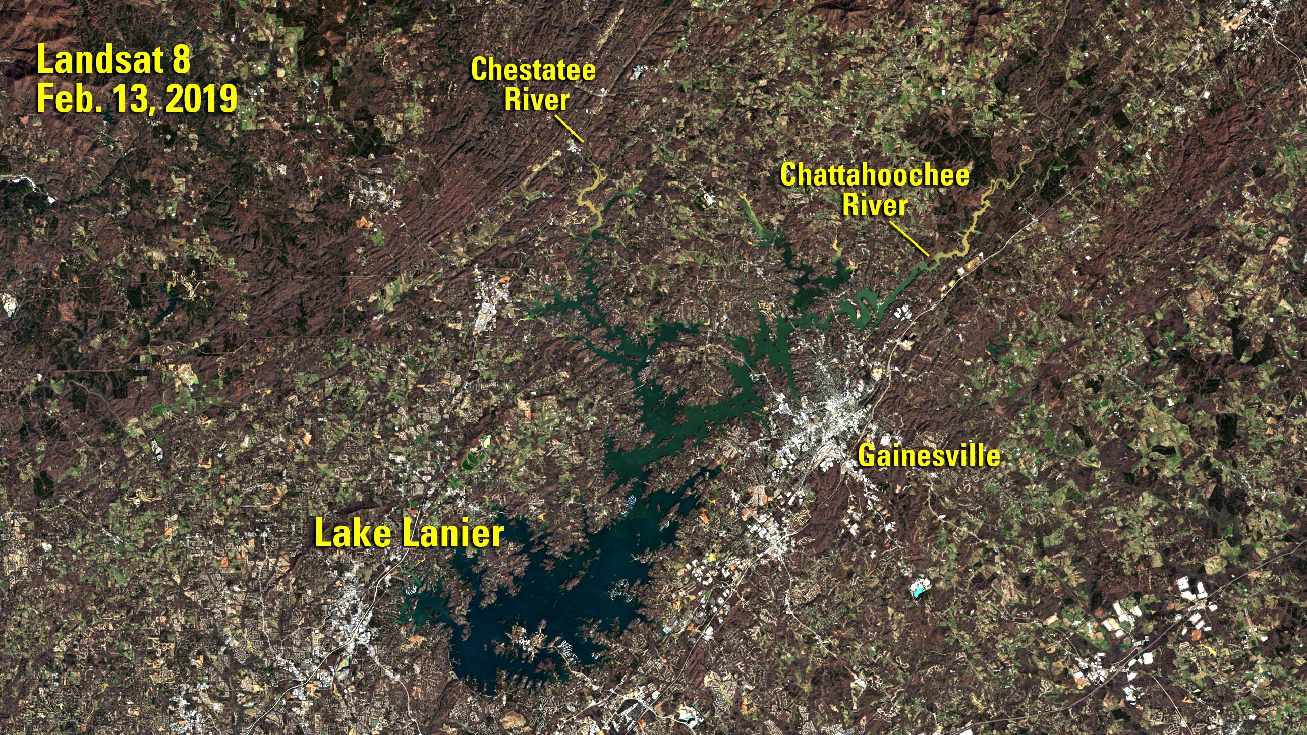 Natural color Landsat 8 image of Lake Lanier, captured Feb. 13, 2019.