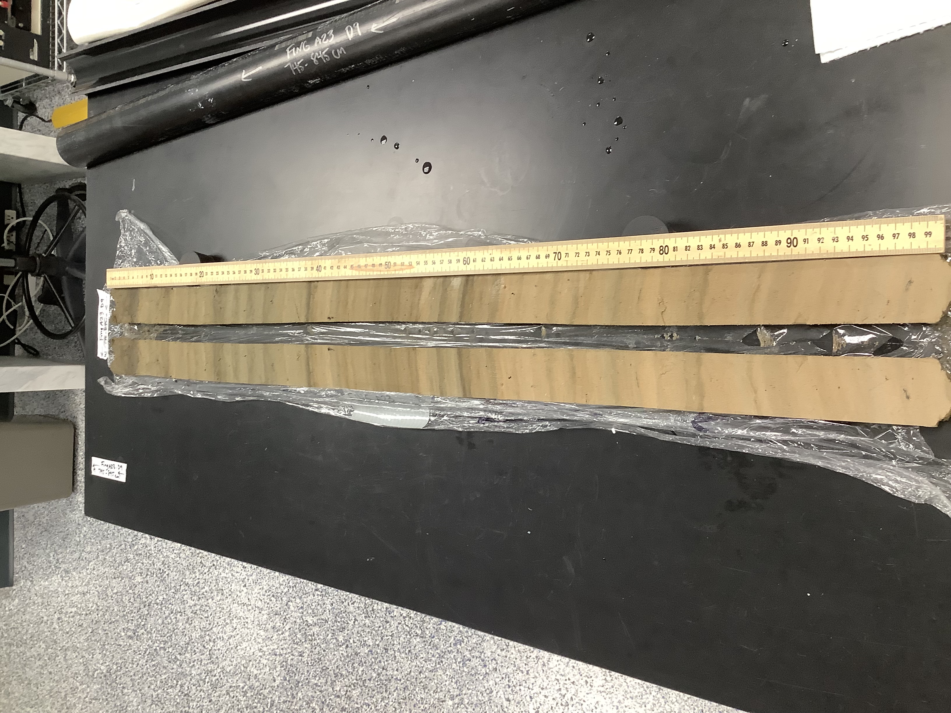 A freshly opened lake core from Alaska with continuous sediment layers that get older from the top of the core to the bottom.