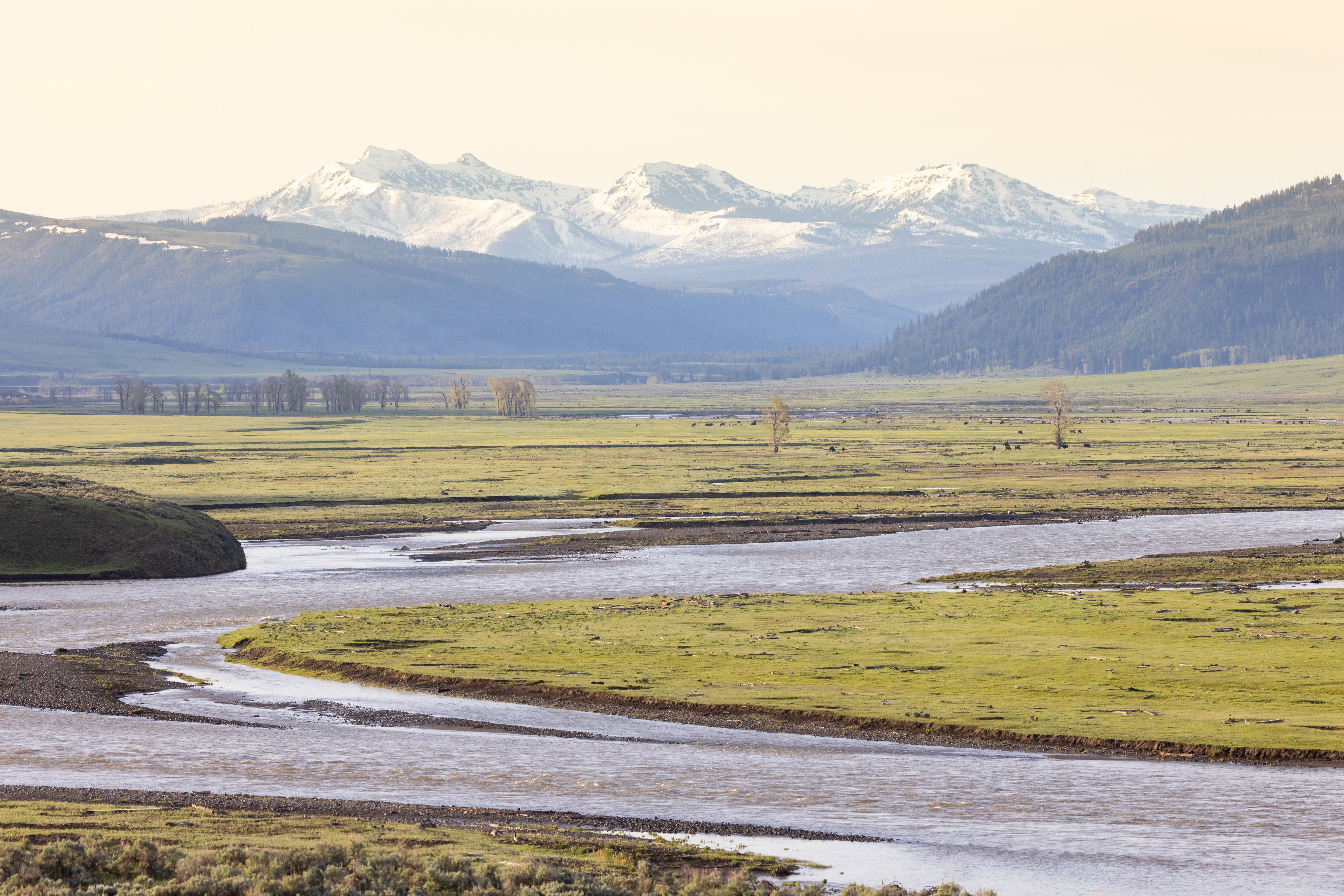 An image of the Lamar River flowing through a green, early-spring Lamar Valley in Wyoming.