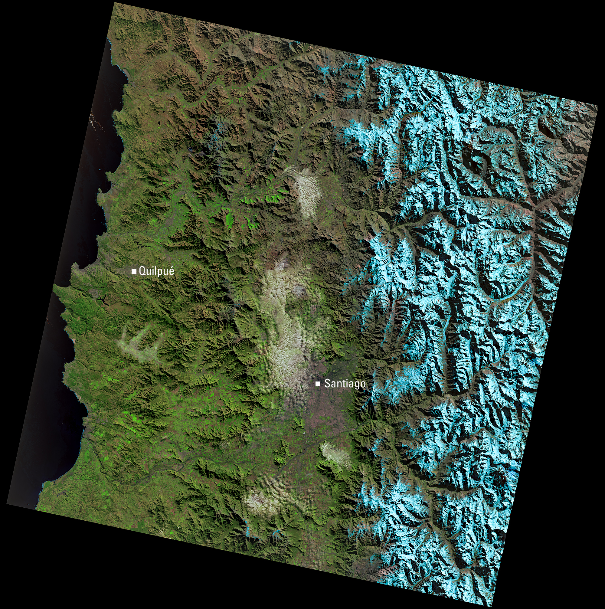 This Landsat 9 image of central Chile, acquired July 10, 2025, uses the shortwave infrared, near infrared, and red spectral bands ( bands 6,5,4) to highlight land cover. In this combination, healthy vegetation appears bright green, while snow and ice in the Andes Mountains show in bright blue. The scene includes the coastal city of Quilpué, the capital city of Santiago, and the agricultural valleys in between.