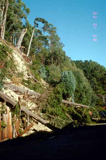 Landslide-displaced trees reflect earthquake-triggered slope failure along coastal bluff, New Brighton Beach area, Santa Cruz County.