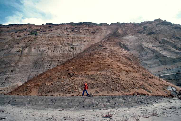 Landslide north of Fort Funston. Slide mass contains approximately 2,830 cubic meters (3,700 cubic yards) and is 30 m (100 ft) high. Photo 35 provides an aerial view of this slide.