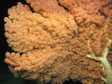 A large colony of Paragorgia arborea (commonly known as bubblegum coral) growing in Baltimore Canyon.
