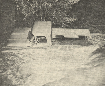 A large log flowing down Rapid Creek pushed this pickup into the stream at the Jackson Boulevard crossing in Rapid City. Photograph courtesty of the Rapid City Journal (used with permission).