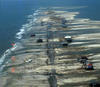 Dramatic shoreline erosion and large overwash deposits along Dauphin Island during Hurricane Katrina (2005) demonstrate classic barrier island rollover.