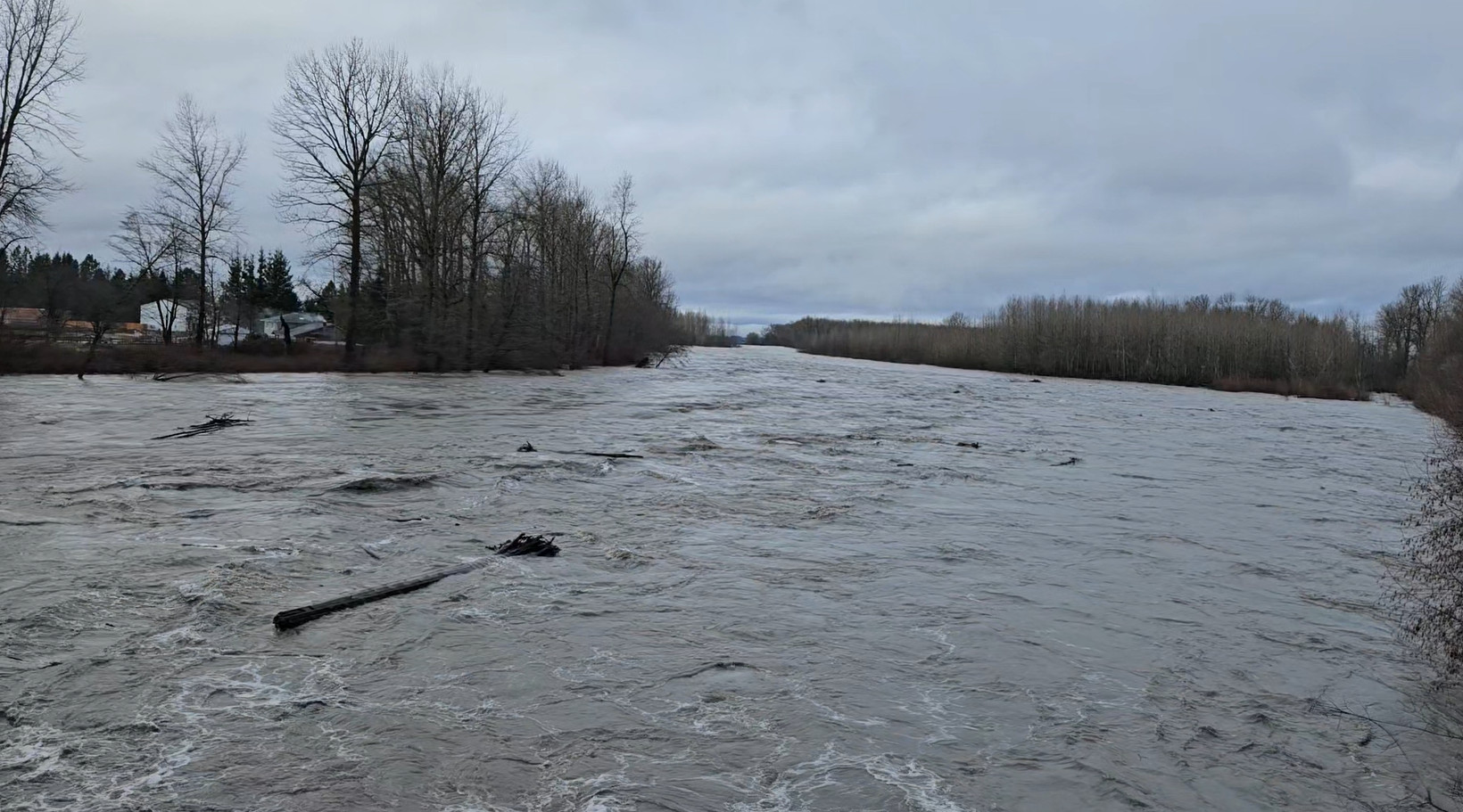 Large logs and root balls float downstream during a high flow event on the Nooksack River near Everson.