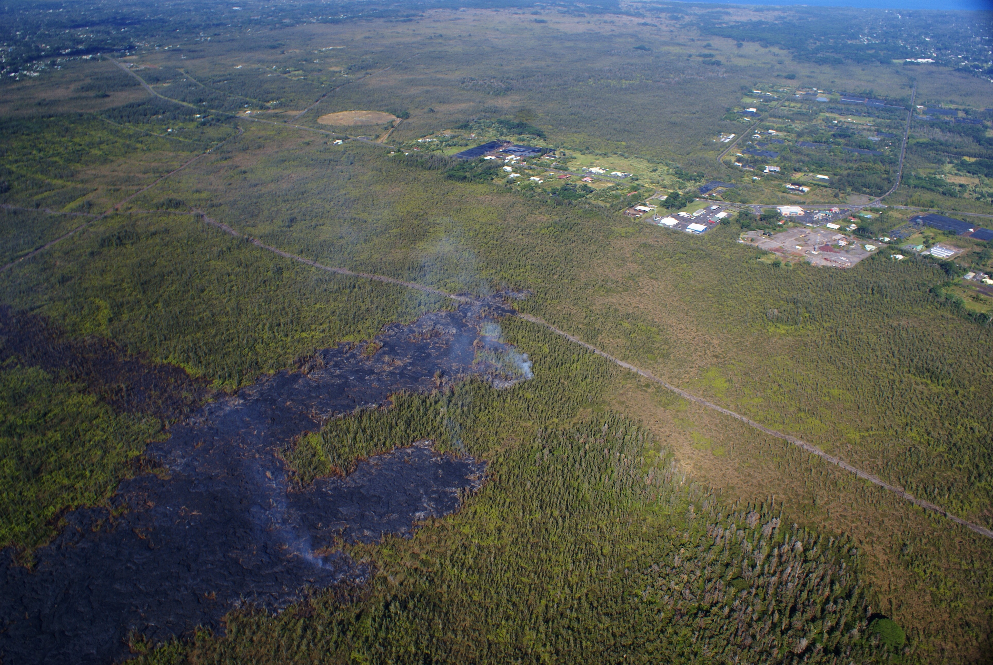 The leading part of the flow consisted of several small, active lobes this afternoon. The front of the lobe that crossed the firebreak was stalled, though breakouts were active about 50 m (55 yd) upslope. Another lobe (area of most visible smoke in center) was about 300 m (330 yd) upslope of the tip and 150 m (165 yd) upslope of the firebreak. A third lobe was 350 m (385 yd) upslope of the firebreak. The view is to the northeast.