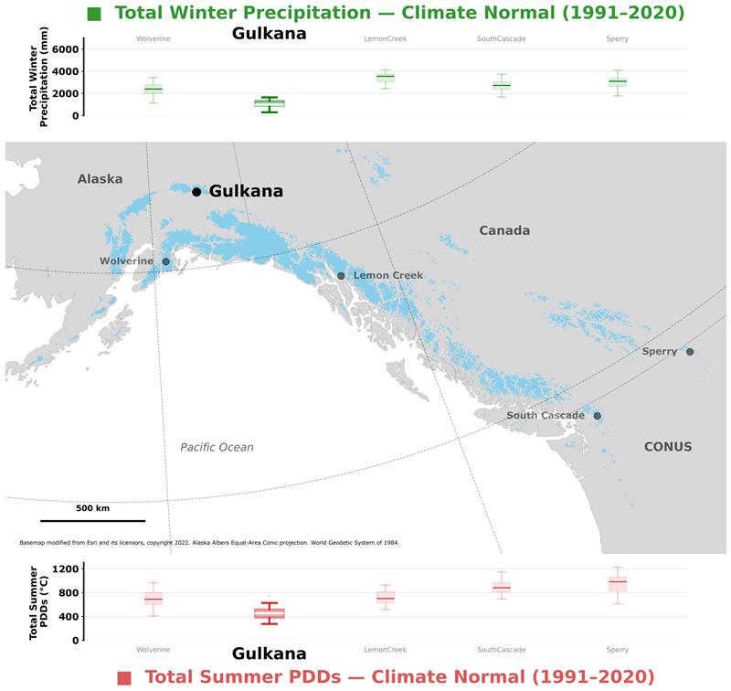 Fig. 1. Top panel shows, Benchmark Glacier total winter precipitation at the median elevation of each glacier, based on local weather station data (O'Neel et al., 2019), for the 1991 – 2020 climate normal period. Map shows the location of Gulkana Glaciers (large black dot) among the Benchmark Glacier network (smaller black dots). Glaciers of the Contiguous United States (CONUS), Canada, and Alaska shown in blue (Randolph Glacier Inventory, 2017). Bottom panel shows, Benchmark Glacier total summer positive degree days at the median elevation of each glacier, based on local weather station data (O'Neel et al., 2019), for the 1991 – 2020 climate normal period.