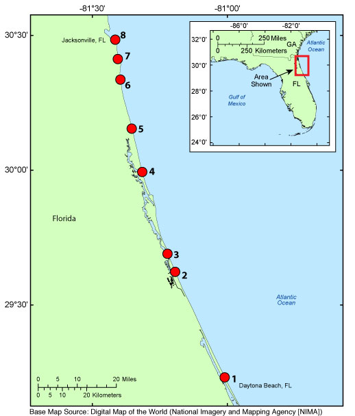 Locations of observed coastal change due to Hurricane Irma on the east coast of Florida.
