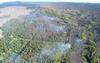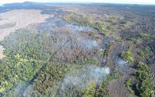 Looking upslope across burned area in upper Royal Gardens subdivision. The near cross street is Tuberose, the far, Ekaha. The Ekaha-Warrior intersection--the first inundated by the HALP flow--is barely visible in the upper left corner of the subdivision. The left-hand street is Ali'i, headed diagonally upslope to smoky country. Prince (right-hand street) parallels Ali`i. An unpaved lane lies between Ali`i and Prince. The tip of the flow is just downslope from Tuberose and east of Prince, along the margin of a 1984 `a`a flow. Most of the area enclosed by Ekaha, Prince, Tuberose, and Ali`i has been burned in the past week. Pu`u `O`o is in extreme upper left.