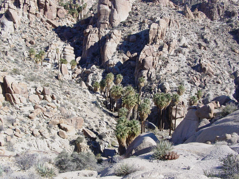 Lost Palms Oasis is the destination of an eight mile round-trip hike through the Colorado Desert in southern Joshua Tree National Park. Over a hundred California fan palms grow along a section of canyon with a series of seeps and springs at the western end of the Eagle Mountains.