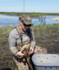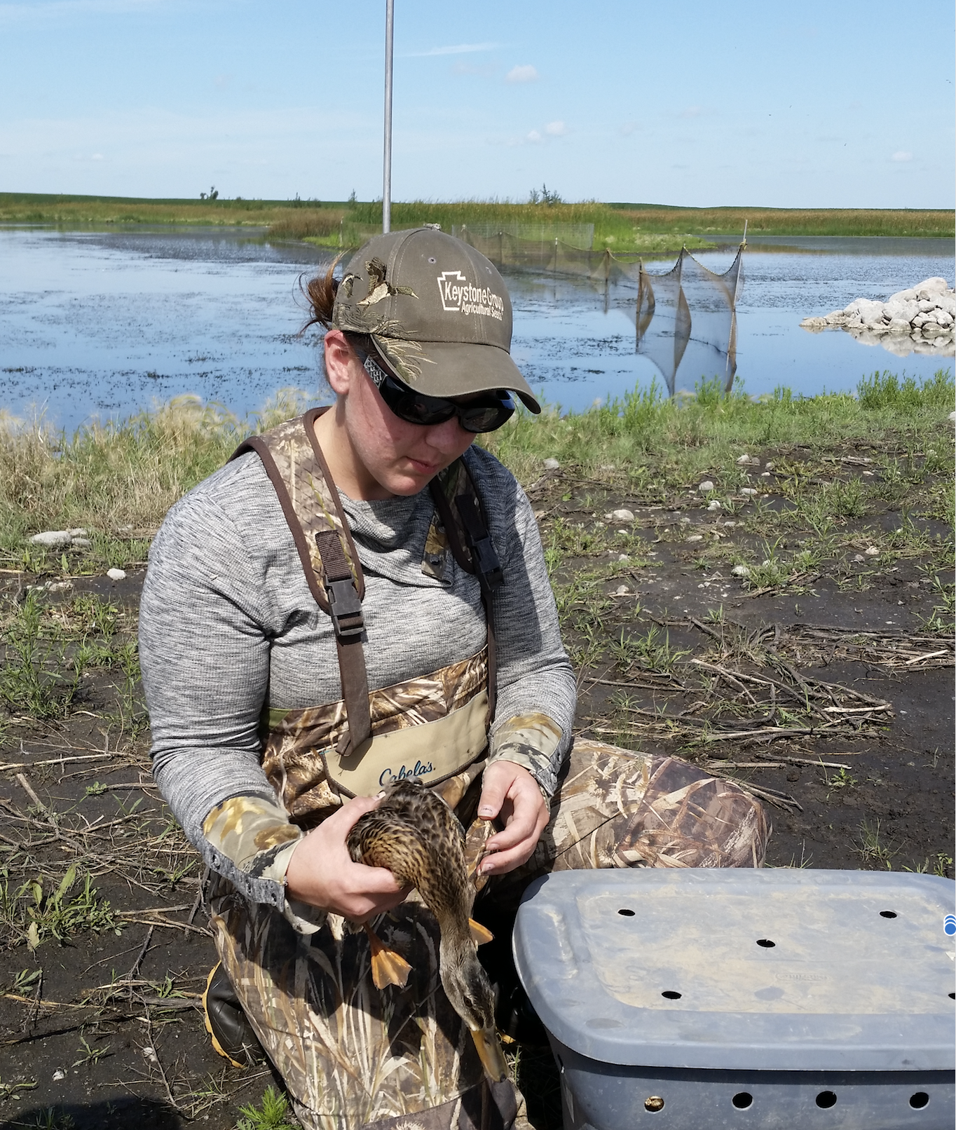 South Dakota State University graduate student, Cynthia Anchor, inspects a captured flightless mallard before implantation of transmitter.