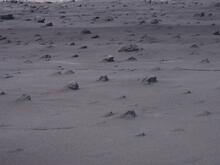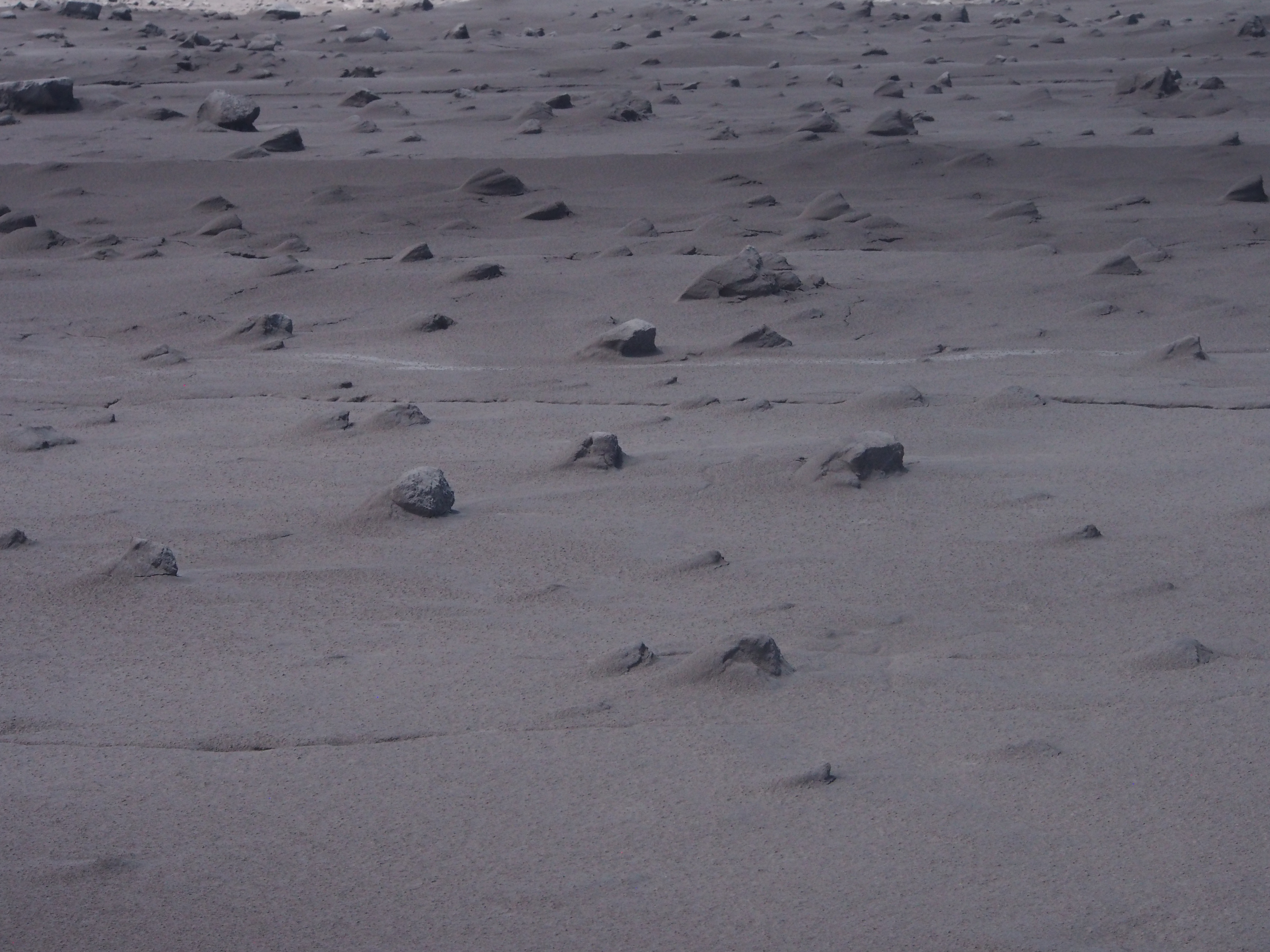Many large blocks appeared to be in depressions in the ash, but upon closer examination, it was concluded that wind had winnowed ash from around the blocks, creating a false impression that the depressions were made by impact. In places, ash has accumulated on the upwind sides and been removed from the downwind sides of the ballistics, giving a smooth streamlined appearance to the parking lot.
