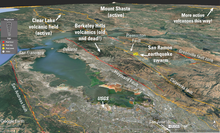 This oblique Google Earth map shows the location of the 2026 San Ramon earthquake swarm, along with notable faults in the San Francisco Bay area and the nearest volcanic areas to the swarm. Google Earth image modified by J. Ball, USGS.