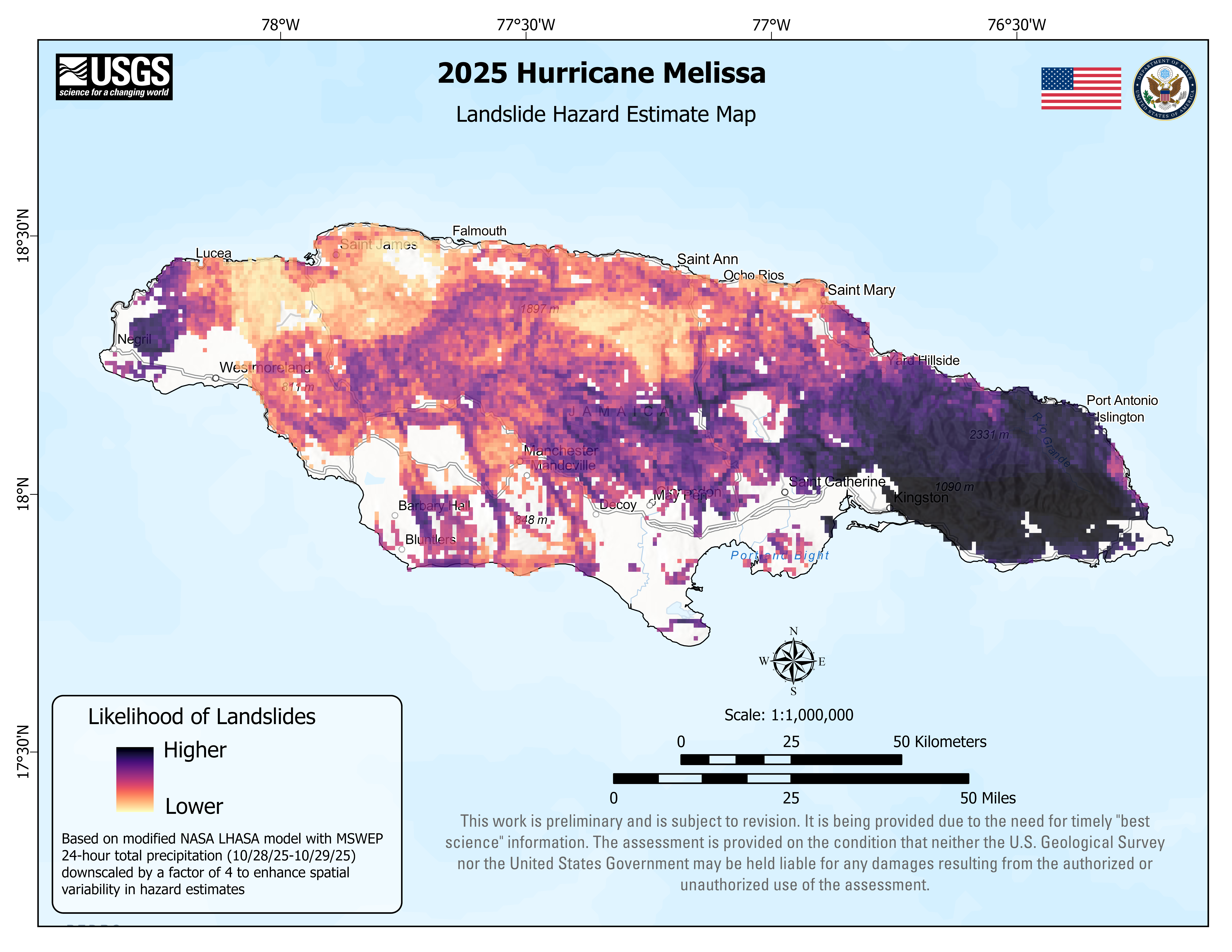 Map of landslide hazard in Jamaica following 2025 Hurricane Melissa
