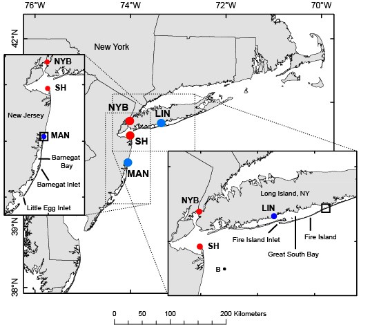 Map of Middle Atlantic Bight showing locations of water level stations at Mantoloking, New Jersey (MAN) and Lindenhurst, New York (LIN) in blue (in estuaries behind barrier islands); and at Sandy Hook, New Jersey (SH) in red (used as proxy for offshore water level). The Battery in New York (NYB) is also shown in red, but is not included in the analysis shown here. Inset maps show Barnegat Bay (left) and Great South Bay (right) and open squares show the location of breaches at Mantoloking, New Jersey and Old Inlet, New York that occurred during Hurricane Sandy.