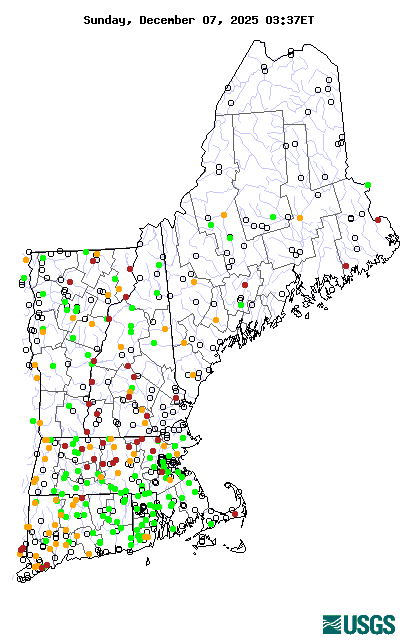 This is a static map, however the map on the USGS WaterWatch page shows the current real-time streamflow conditions for New England stations.