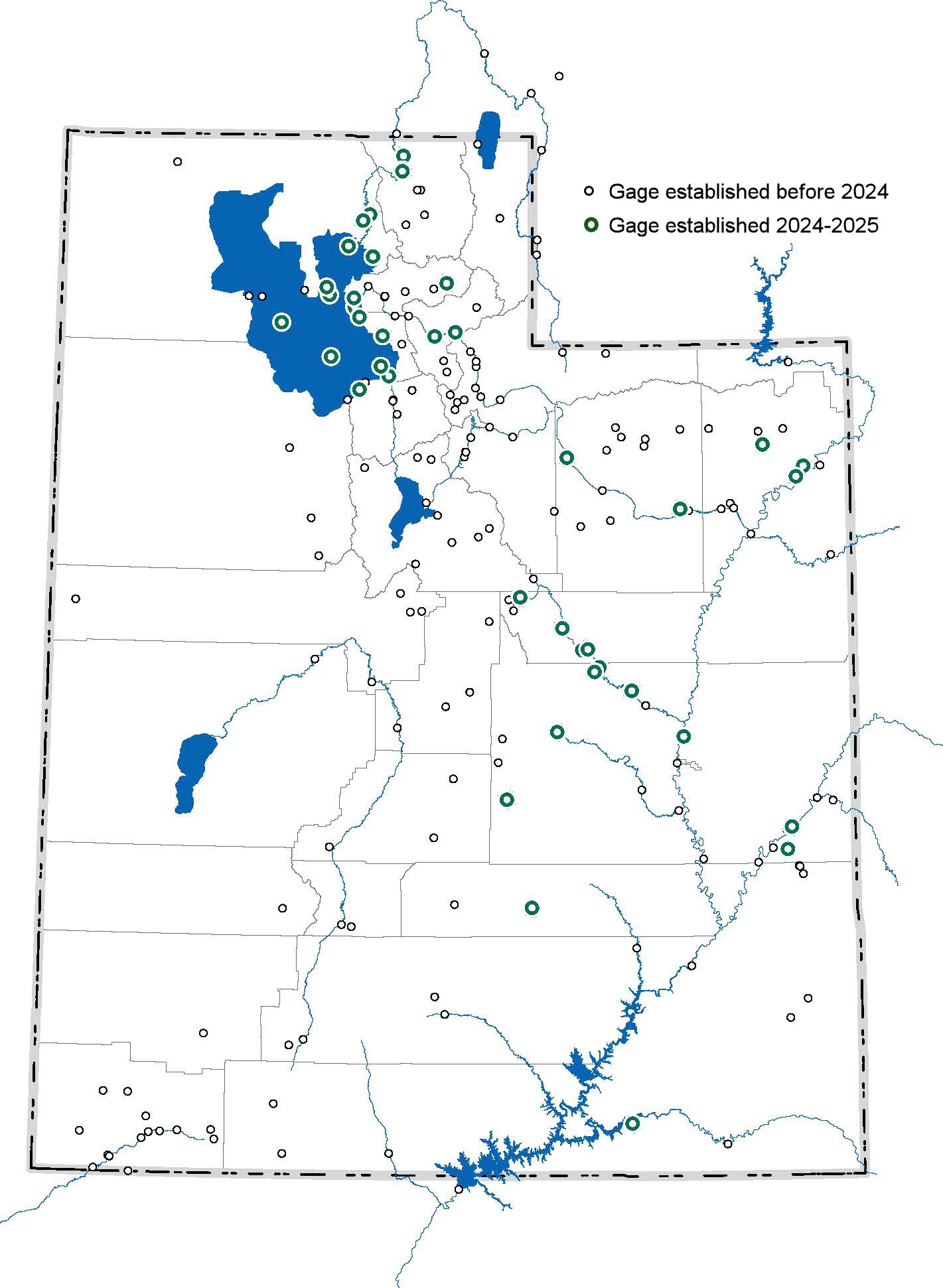 This image of Utah includes 187 surface water gages with continuous records. Thirty-eight sites in green were established during June 2024-July 2025, a record achievement.