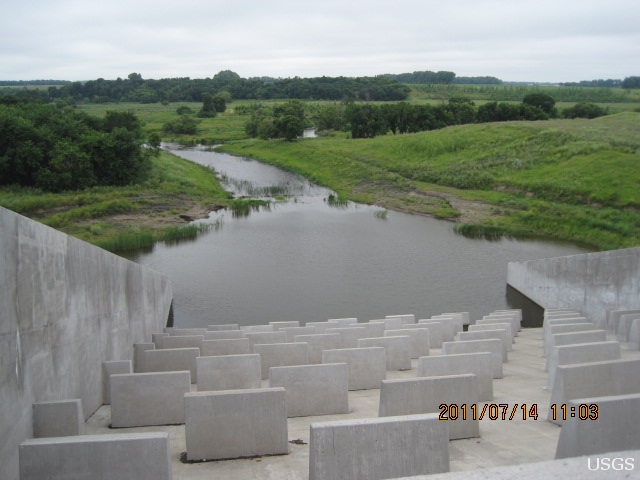 The Maple River Dam Spillway on July 14, 2011, with a streamflow of 809 cubic feet per second and a gage height of 1,027.30 feet.