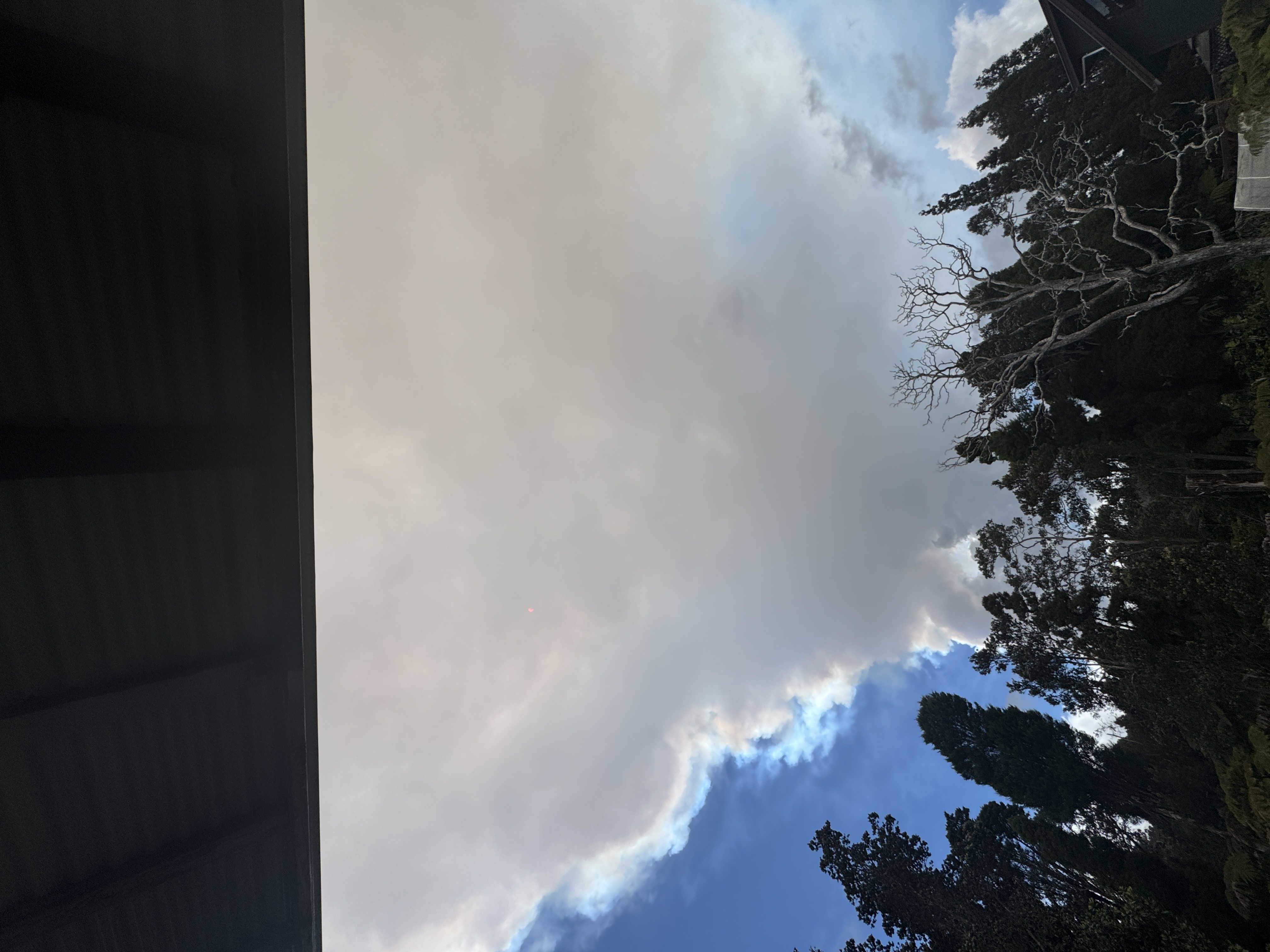 The dual fountains that erupted during Kīlauea summit eruption episode 43 on March 10, 2026, produced significant heat and ash, creating an eruption plume. The plume reached 10,000 feet (3050 meters) above sea level at 10:10 a.m. HST, over 20,000 feet (6100 meters) by 11:30 a.m. HST, and over 25,000 feet (7600 meters) above sea level by 10:50 a.m. HST. The maximum plume height exceeded 30,000 feet (9100 meters) above sea level by 11:30 a.m. HST. Light southwest winds at lower elevations pushed the plume and tephra fall to the north and east. This photograph, which looks toward the summit of Kīlauea, shows the plume traveling overhead. USGS photo.