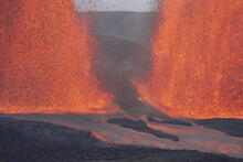 This photo shows the gap between the south (left) and north (right) lava fountains on March 10, 2026, as well as the lava channels that transport lava from the vent to the eastern crater floor. These fountains were active during episode 43 at the summit of Kīlauea. USGS photo by M. Patrick.
