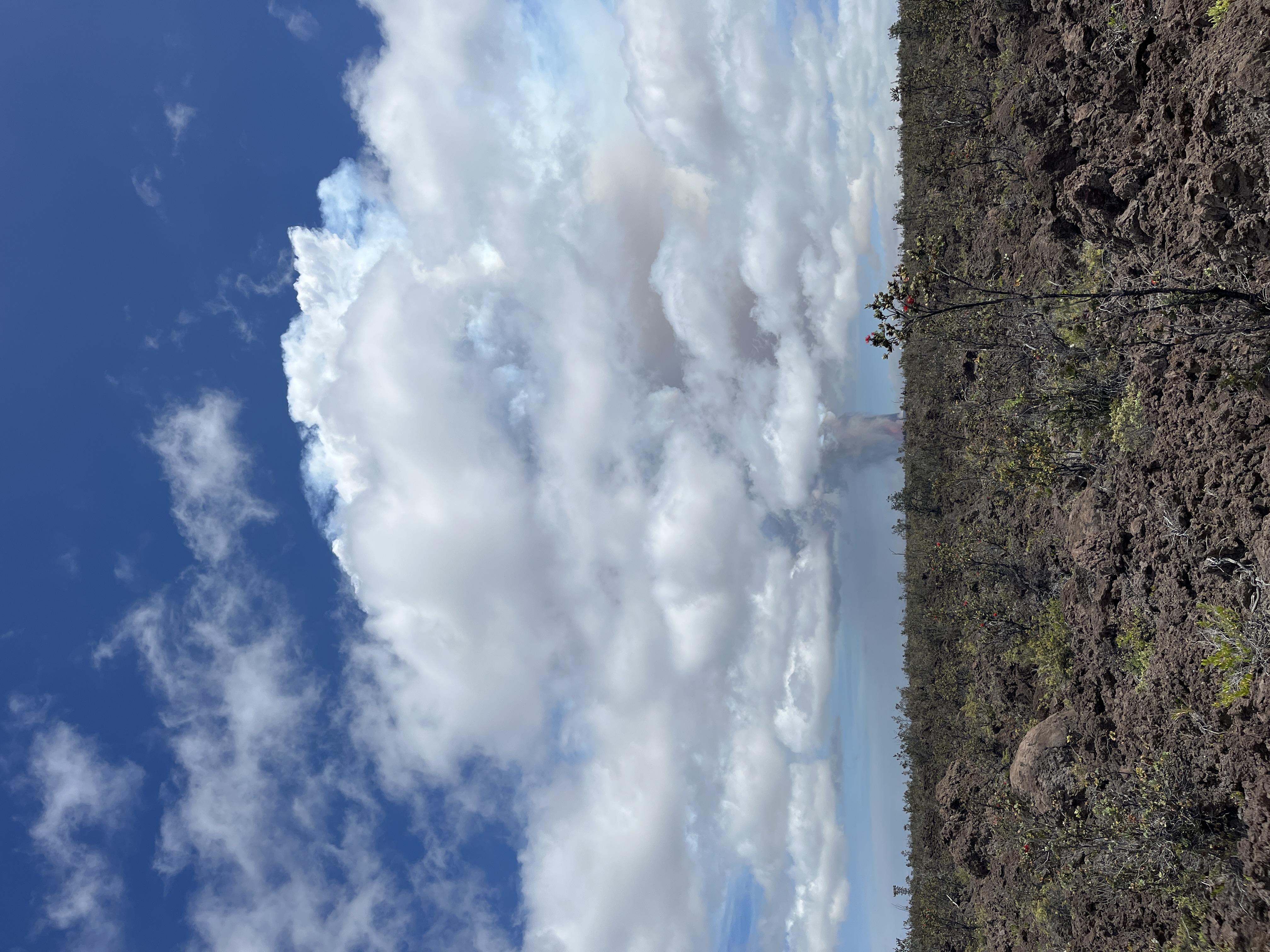 Episode 43 of Kīlauea's ongoing summit eruption started at 9:17 a.m. H.S.T. on March 11, 2026. This photo was taken at noon from the Footprints Trail looking east. This site is nearly 6 miles (9 miles) from north and south vents. The fountain from south vent is clearly visible, along with towering volcanic plume. The blue tinge at the top of the plume is often associated with sulfur dioxide gas. The fountaining activity was audible from the trail. USGS photo by N. Deligne.