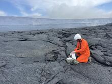 A USGS Hawaiian Volcano Observatory geologist collects a cooled sample of episode 43 lava from the floor of Halema‘uma‘u crater, at the summit of Kīlauea. Sampling in this area, which is culturally significant to the Native Hawaiian community, is down with permission from and coordination with Hawai‘i Volcanoes National Park. The chemistry of these samples is analyzed to better understand the magmatic plumbing system and hazards associated with the ongoing episodic lava fountaining eruption at the summit of Kīlauea. USGS photo by M. Patrick.