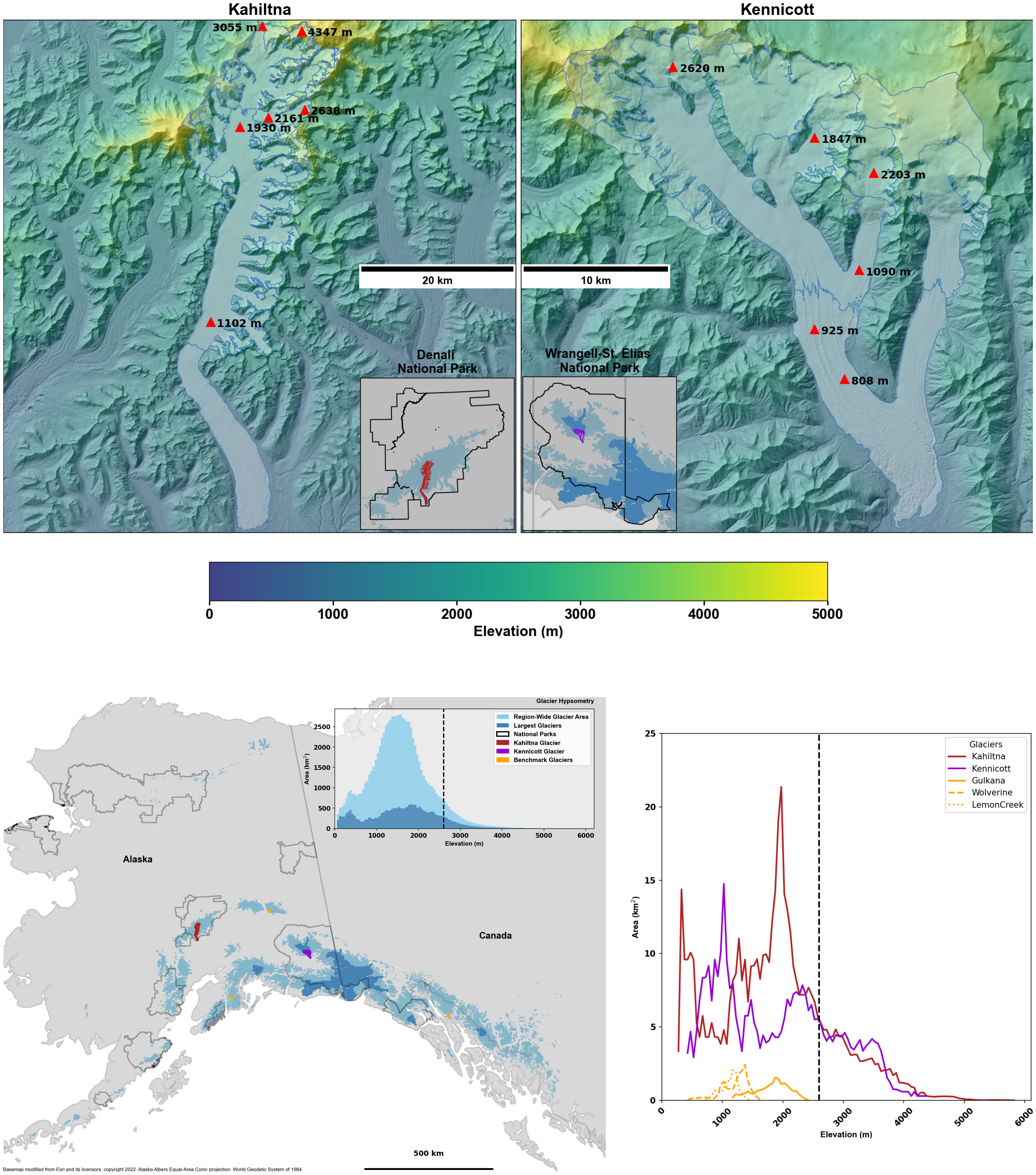 Top panel shows the location of mass balance sites on Kahiltna Glacier (left) and Kennicott Glacier (right). The bottom left panel shows Glacier distribution and National Park Service boundaries in Alaska. Glacier coverage (RGI Consortium 2017) shaded blue with the 100 largest glaciers shown in dark blue. The inset shows glacier hypsometry (distribution of area versus elevation) of the total glacier area and the dashed vertical line at 2,600 m. Bottom right panel shows individual glacier hypsometries (distribution of area versus elevation) for Kahiltna Glacier in red, Kennicott Glacier in purple, and the USGS Benchmark Glaciers in Alaska in gold. The vertical dashed line is at 2,600 m, the approximate base of the percolation zone.